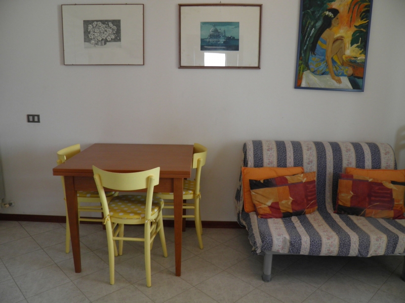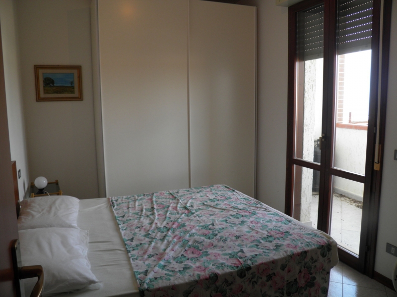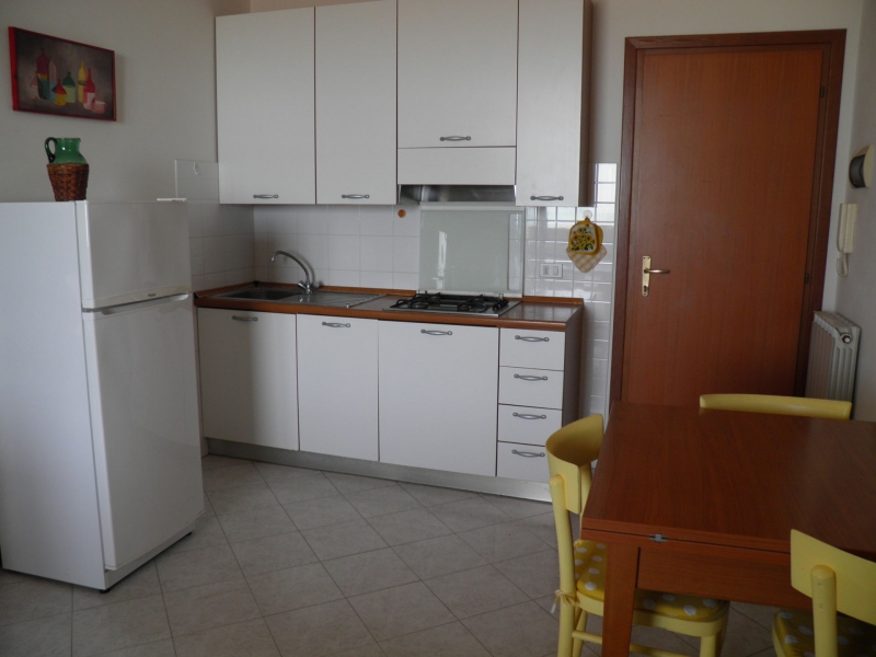 Trilocale al terzo piano con ascensore, camera matrimoniale con terrazzino, camerina con letto a castello, soggiorno con angolo cottura e divano letto singolo, bagno con doccia, ampio terrazzone frontemare, Tv, lavatrice