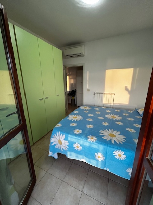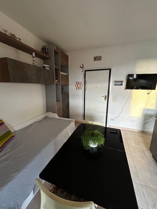 Soggiorno con angolo cottura, lavastoviglie e ampio terrazzone vista mare, camera con letto matrimoniale e apertura sul terrazzo, bagno con doccia e lavatrice, aria condizionata e tenda da sole, posto letto nel soggiorno.