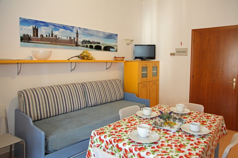 Moderno Bilocale al primo piano con camera matrimoniale con letto aggiunto, soggiorno con angolo cottura e divano letto a 2 posti, bagno con doccia, ampio terrazzone coperto, TV,lavatrice e posto auto.