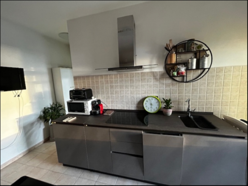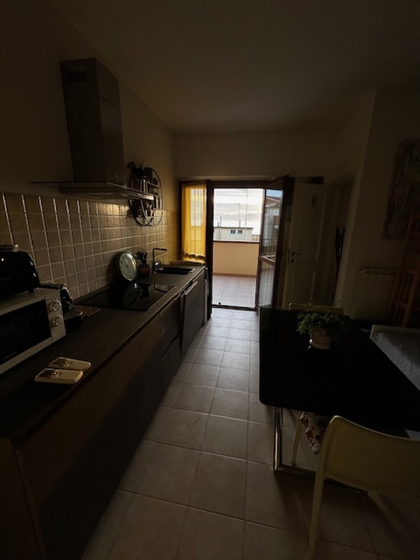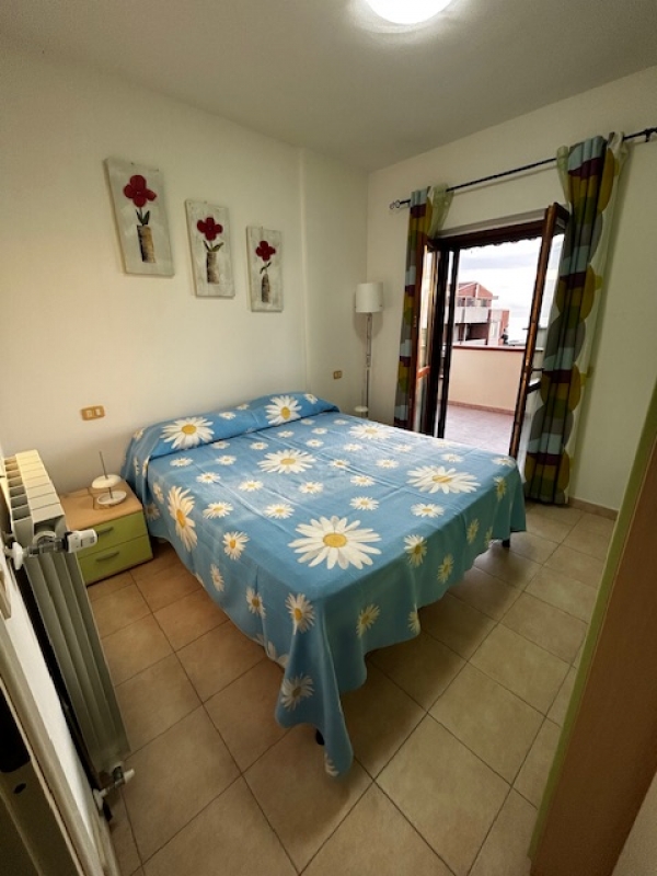 Soggiorno con angolo cottura, lavastoviglie e ampio terrazzone vista mare, camera con letto matrimoniale e apertura sul terrazzo, bagno con doccia e lavatrice, aria condizionata e tenda da sole, posto letto nel soggiorno.
